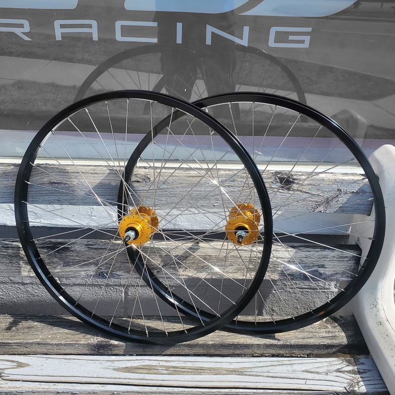 The Monza OEM Wheels are built using double wall rims, alloy high flange hubs with 3/8" axles, and stainless steel spokes. They will work with a 16t or larger freewheel (not included).Double wall rimsGold Loose bearing, high-flange 36h hubs3/8" axles front