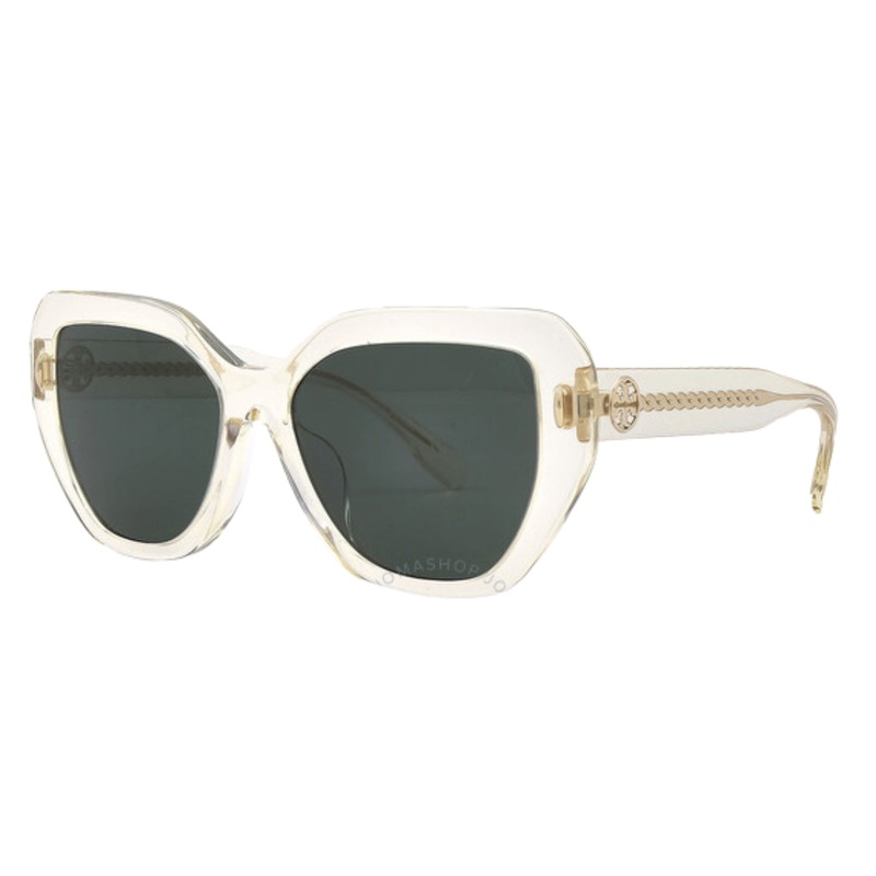 DESCRIPTION The Tory Burch 7194U 1952/3H sunglasses offer a fresh take on classic elegance with a modern twist. Designed in a chic cat-eye shape, the crystal frame adds a unique and sophisticated touch to any look. The solid green lenses provide a striking