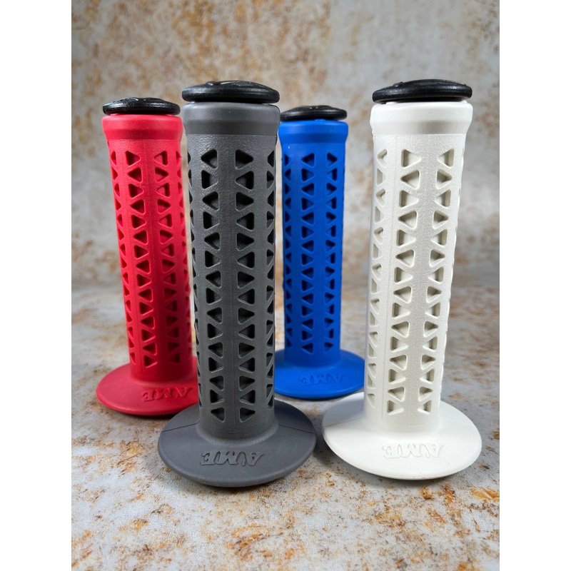 The famous AME Triangle is on the end of one of the most popular BMX Grips of the 1980s. AME is proud to introduce the 702 Grips to the BMX marketplace.The NEW AME 702 Grips are composed of Vulcathane, a specially blended rubber compound combined with UV s