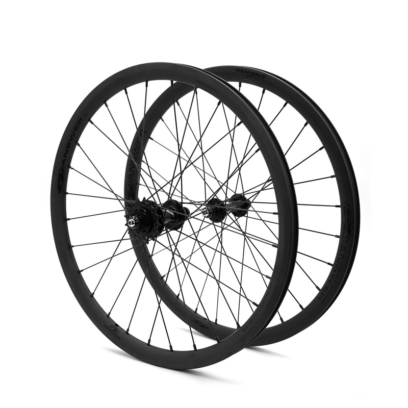 Crafted for precision and performance the Answer Holeshot Mini Carbon BMX Wheelset-28H-20×1 1/8″ is the epitome of speed and reliability on the track. Boasting hand-built Answer Carbon rims laced with black 15G spokes and lightweight brass nipples, these wheels deliver unparalleled strength and agility. Paired with the sleek black Answer Holeshot Mini cassette hubs, featuring CNC machined aluminum hub shells and hollow aluminum axles, these wheels ensure lightning-fast acceleration and unrivaled durability. With a 3-pawl aluminum driver and precision sealed bearings offering near instant engagement, each ride promises precision and power. Handcrafted in the USA, these wheels embody the spirit of craftsmanship and BMX excellence.