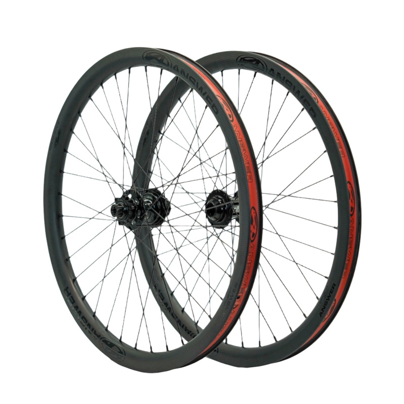 Elevate your racing experience with the Answer Pro Cruiser Carbon Disc Wheelset-36H-24×1.75″, meticulously crafted to deliver unparalleled performance on the track. Hand-built with precision, these wheels feature matte black 36H Answer carbon rims, seamlessly laced with black 15G spokes and lightweight brass nipples, culminating in a sleek and agile design. Paired with Answer Holeshot Pro Disc cassette hubs, with CNC machined aluminum shells and a CNCd front hub body with EZO bearings, these wheels ensure maximum stability and control. With a 14mm rear hollow aluminum center axle and 3/8 (10mm) axle bolt, along with a 6-pawl aluminum driver offering near instant engagement, every pedal stroke propels you forward with confidence and speed.