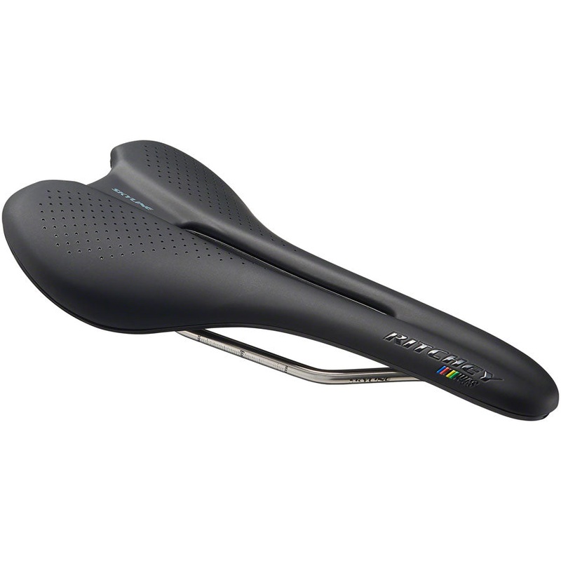 The WCS Skyline saddle features stainless steel rails and an ergonomic curve that supports the sit bones and a generous cutout to relieve perineal pressure. Its curved two-axis shape features a rise towards the rear of the saddle and some rise into the nos