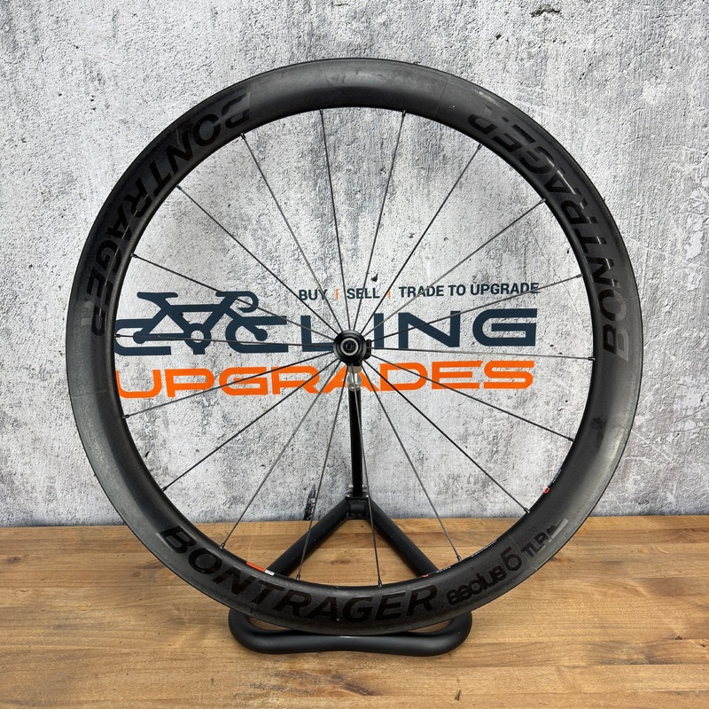 Brand: Bontrager Aeolus D3 5Rims: 50mm deep carbon rim, 27mm external width, 19mm internal width. Tubeless rim tape is present on the wheel, and is tubeless compatible. May require a new application of tubeless tape to successfully setup tubeless.Hub: DT S