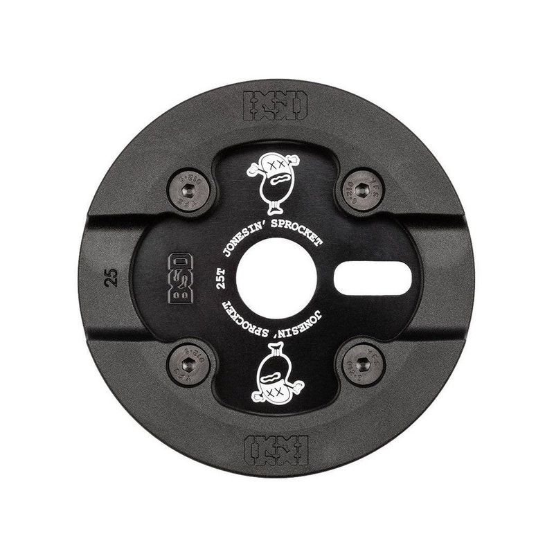 BSD Jonesin SprocketSam Jones has been on another level lately- watching any video that he is in gets us incredibly pumped to head outand shred! This guard sprocket is perfect for destroying the streets whilst keeping your sprocket and chain protected! This sprocket looks as solid as a Dwayne Johnson!Sam Jones chose the plastic guard from the Barrier sprocket and coupled it with a classic look solid chainring to create the new Jonesin sprocket. 25t only for the rail crew…