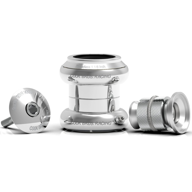 Cook Bros. Racing Stainless Headsets feature two super-smooth, 4545, sealed bearings covered by a coating of titanium nitride and filled with stainless steel balls. The titanium coating delivers a low friction coefficient, increased corrosion resistance and smoother rolling surfaces. Stainless steel balls further increase corrosion resistance. Cruise longer and smoother. A reusable, anodized aluminum, compression plug eliminates the need for a star nut and works with all 1 1/8-inch steerer tubes,even carbon fiber, making this the most versatile headset system ever.