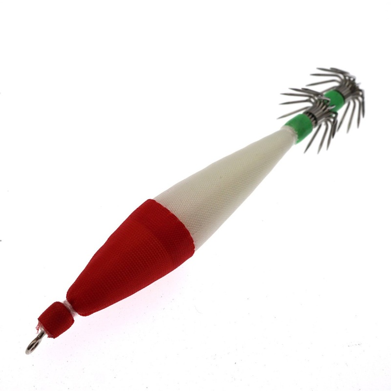 Light-weight squid jigs in a white-red color combination with double hooks.