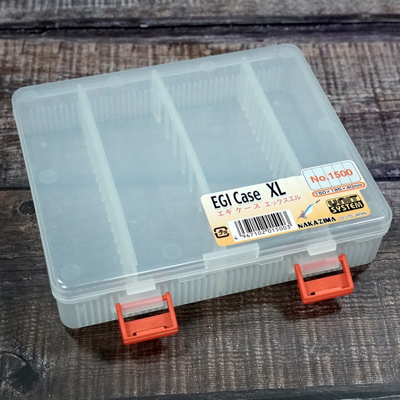 Transparent, plastic case for egi squid jigs.Transparent, plastic case for egi squid jigs.Suitable for squid jigs with external sinker.Partitions keep squid jigs fixed in one place, protecting the hooks and their bodies from potential knocks or scratches.I