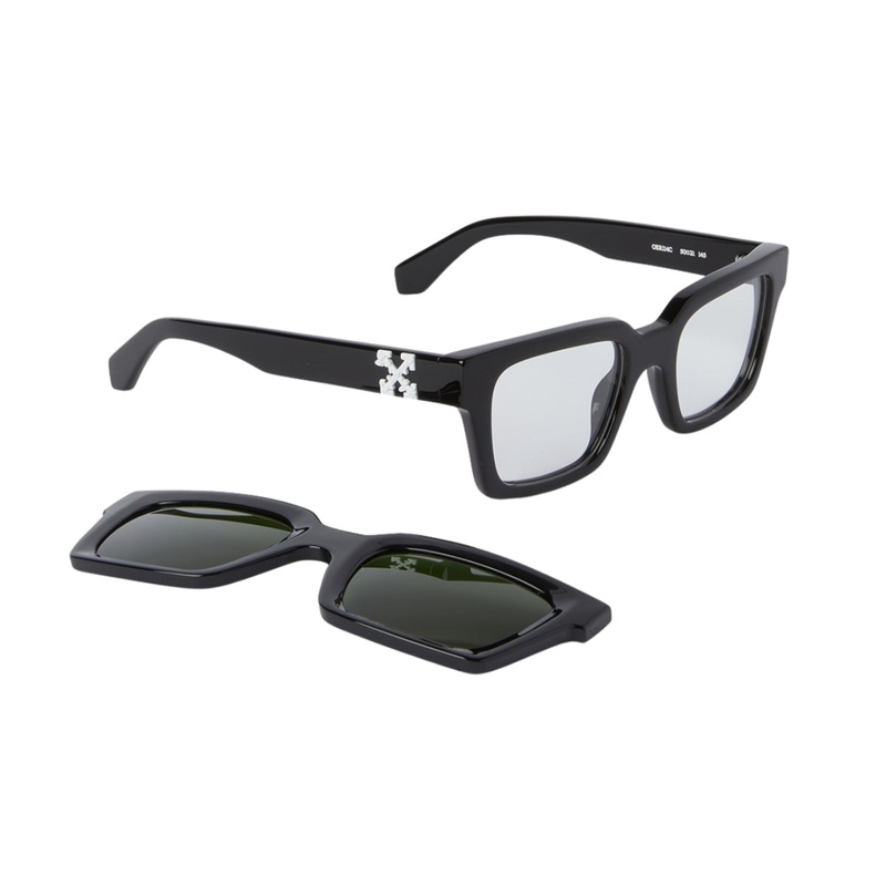 DESCRIPTION The OFF-WHITE OERI14C 1055 CLIP ON sunglasses feature a timeless square design crafted from sleek black acetate. With clear lenses, this model embraces a minimalist, classic aesthetic that suits any look. The clip-on function adds a practical e
