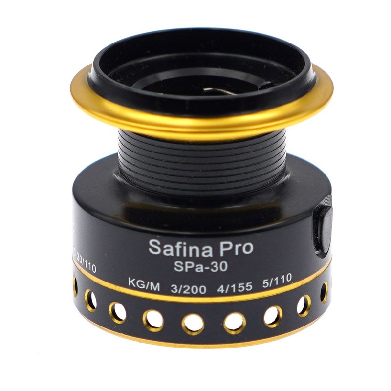 Genuine, unused spare spool for the Okuma Safina Pro Spa-30.Genuine, unused spare spool for the Okuma Safina Pro Spa-30.Made of aluminum.The Front Drag Knob is not included.Technical CharacteristicsModel: Okuma Safina Pro Spa-30Color: Black & GoldCapacity: