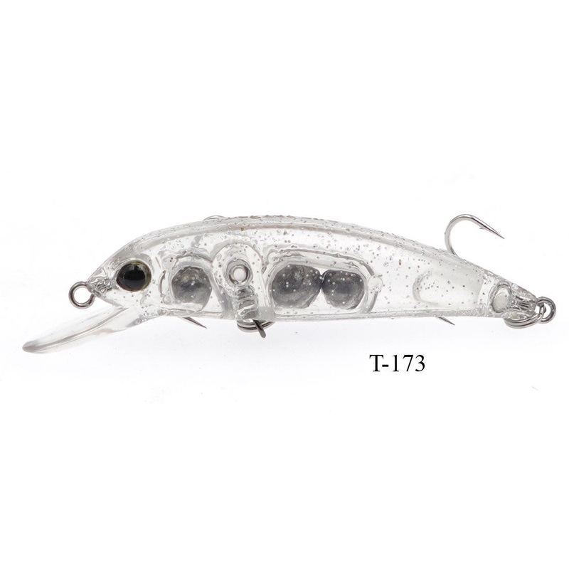 This tiny, Sinking Minnow is only 50 mm long and weights 5.3 grams. The treble hook placed in its belly, is adjusted on a swivel to avoid hook outs during battle. Palms calls this Anti Hook Out System.