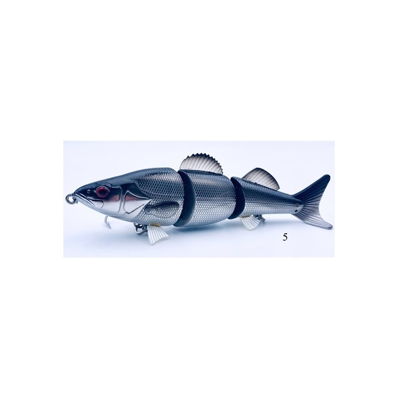 The jointed swimbait is a hard bodied swimbait, with the same paint schemes as its bigger brothers. The fins on this bait are made of a bendable hard plastic, and the three piece body is held together by the pin and tenon hinge system.