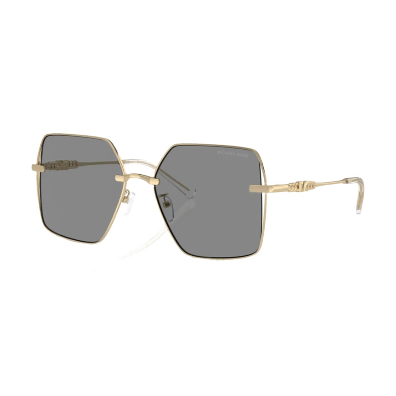 DESCRIPTION Make a bold fashion statement with the MICHAEL KORS SANYA 1157D 1014/3F sunglasses. Featuring an oversized square silhouette and a sleek gold metal frame, these sunglasses exude modern glamour with a touch of vintage charm. The solid grey lense