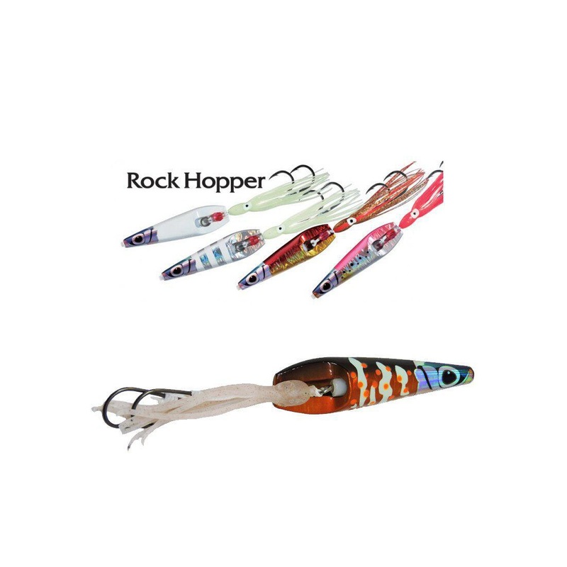 The Shimano Rock Hopper jigs are a hybrid lure that combine various elements of different fishing styles. It is an Inchiku style metal jig, with the properties of a Free Slide, that can be fished with Tai Rubber equipment.The Shimano Rock Hopper jigs are a