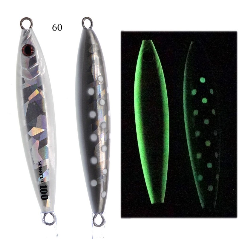 One side of the Shotel jig is almost straight, as it consists of one flat side and 2 narrow edges intersecting each other. On the same side, Shout has placed details such as the eye and gills, while the other side resembles a boats keel, without edges. Both sides of the jig have impressive fluorescent elements and holographic finish.