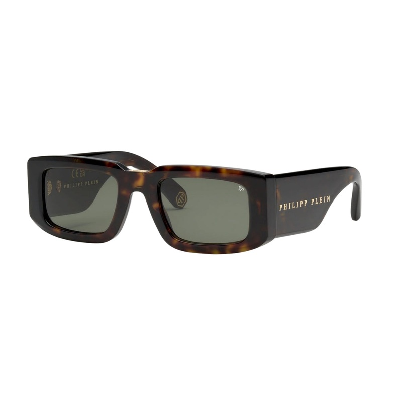 DESCRIPTION Philipp Plein sunglasses model SPP149V 0722 embody classic elegance with a bold edge. Featuring a refined rectangular shape and a rich Havana brown acetate frame, these sunglasses offer a timeless look with modern appeal. The solid green lenses