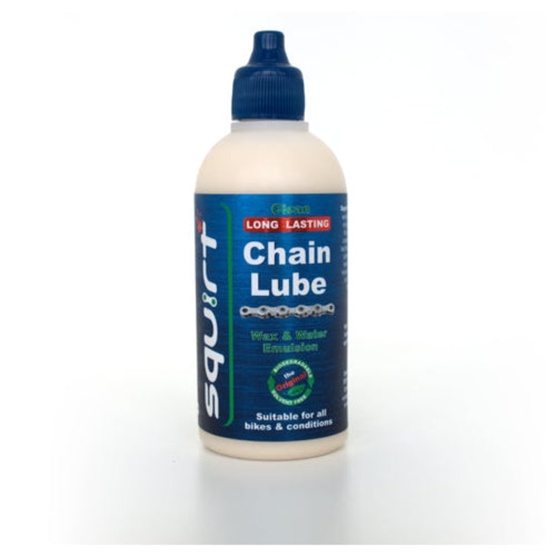 Squirt is what every cyclist wants:Along-lasting dry chain lube that does not gather dirt. The first successful biodegradable wax/water emulsion containing as much wax as needed to last for the duration of a marathon ride. It prolongs the life of your drivetrain by reducing friction while improving shifting and reducing irritating dry chain noise. No degreasing is required for repeat use. If needed, your chain can be cleaned with a clean, dry brush.