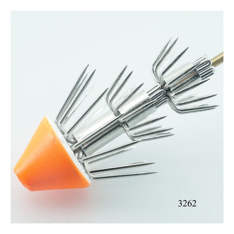 Stainless steel shaft squid jig with phosphoresecent sinker and multiple rows of hooks.