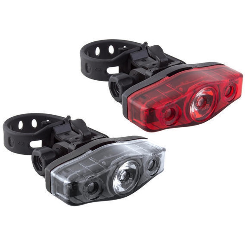 – Front 10 lumen, Rear 4 lumen 3 LED – 4 modes each – 1 constant, 3 flashing – AAA batteries included – Water resistant construction – Easy to use, multi fit silicone rubber mount