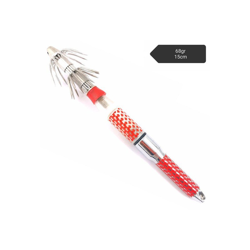 White coloured squid jig by Technofish, with lead sinker and two rows of stainless steel hooks.White colored, hand made jigs, for the Europear Flying Squid, made by Greek company Technofish.They are equipped with with lead sinker and two rows of stainless