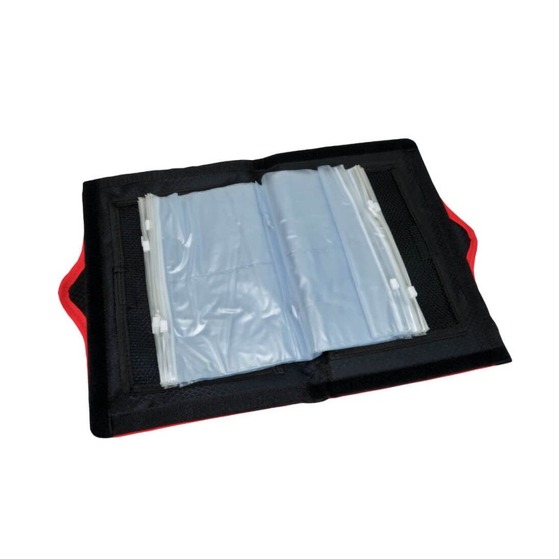 The 16 plastic zipped bags are removable and divided in two for maximizing carrying capacity and can be easily replaced.