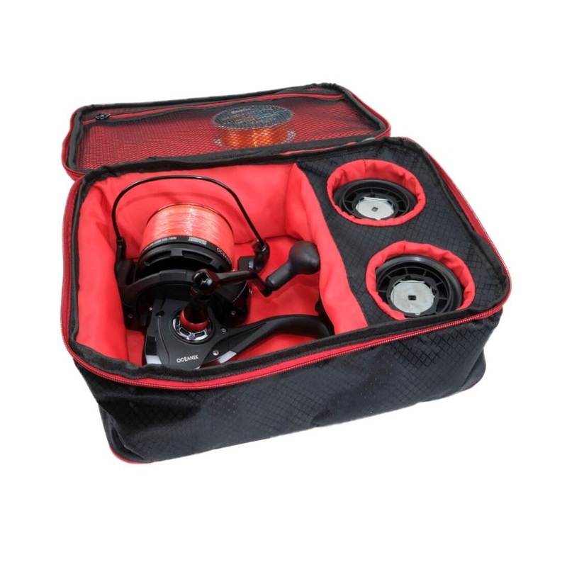 The main compartment is large enough to accommodate even the largest fixed spools on the market. Two separate, padded pockets to the side will carry two spare spools securely.The lid has a zipped, mesh pocket that runs the full length, ideal for storing extra bits of kit, such as shock leader material, spare spool bands and other close to hand reel items.