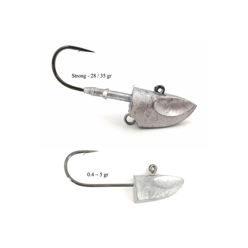 The Strong jig heads include a whole range of models, with toughened hooks, heavier heads, while maintaining the touch-down features such as the horizontal fall, darting performance and the wobbling of silicone baits, squids, etc. in response to water currents. The sharp and pointy shape of the jig head, is what Xesta added to make the Touch Down Strong ideal for darting action to be produced.